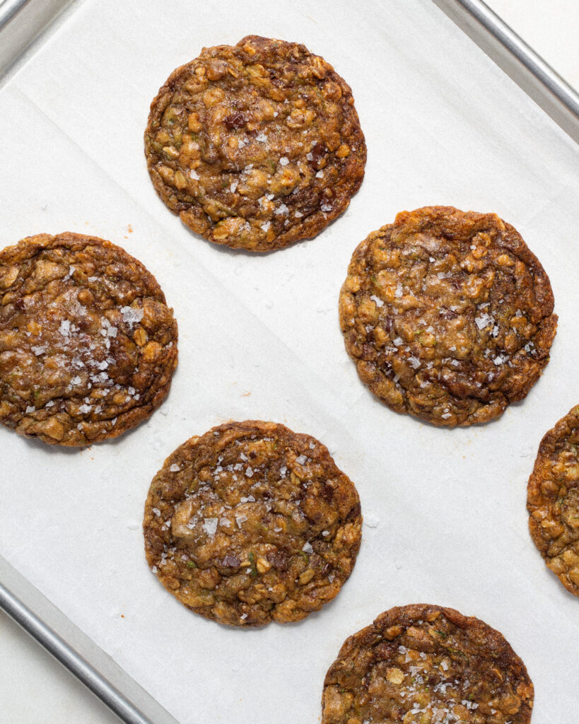 These were delicious! The nuttiness of the brown butter/toasted oats complements the zucchini and dark chocolate really well. I substituted gluten free flour, but they still spread out and caramelized nicely while baking.