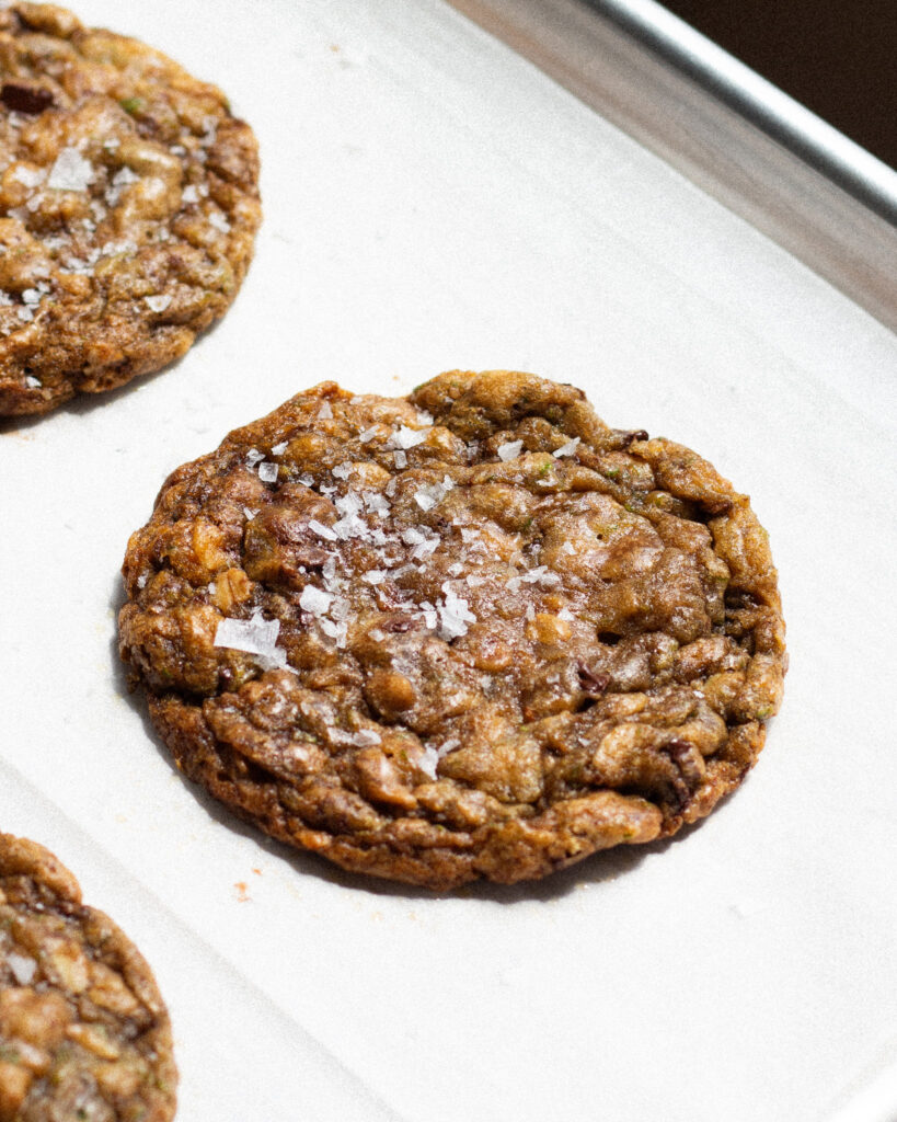 These cookies are cookies designed for people who love oatmeal cookies, and that’s because along with the zucchini, the oats are the star. I use a method where I brown the butter and toast the oats together, making the oats all buttery, toasty, nutty and chewy, which enhances the cookie tenfold. The zucchini gives back any moisture that the oats have absorbed from the butter, and everything comes together to make an oat-filled, sticky but soft chocolate chip cookie!