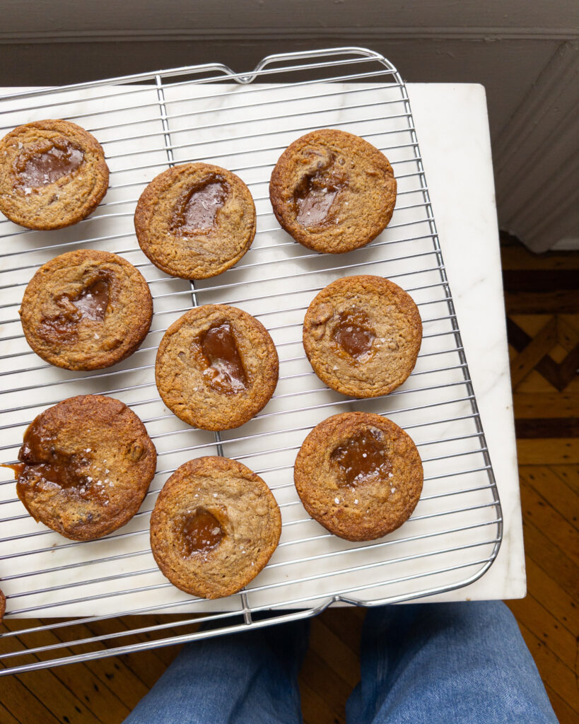 I love your cookie recipes, but these were a huge fail for me. I think my toffee needed more than 4 minutes. I have a thermometer but couldn’t use it with such a small volume. The toffee didn’t sink at all and just made huge puddles around the cookies. The cookies themselves also didn’t seem to work. They never got golden and stayed weirdly pale even after an extra 6 minutes in the oven. I eventually just decided to give up and will probably compost these 🙁 The dough and toffee tasted great, they just never came together.