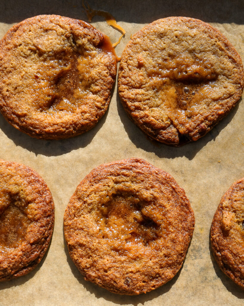 This was delicious but even after experimentation sheet to sheet (e.g., 6 minutes until toffee application, 7 minutes, 8 minutes…), I never figured out how to get the toffee to stay put. I needed to scrape it all back onto each cookie at the end of the bake. Is it possible I didn’t cook the toffee properly? I didn’t have a candy thermometer so I just cooked for four minutes. The cookies themselves seemed to bake well, thankfully, and are beautifully caramelized. It was just a lot of work to fix the toffee