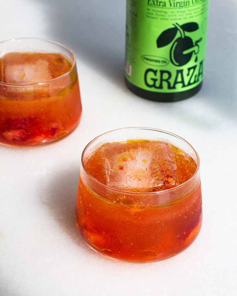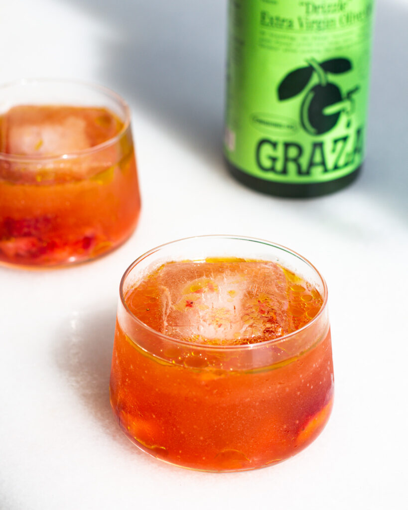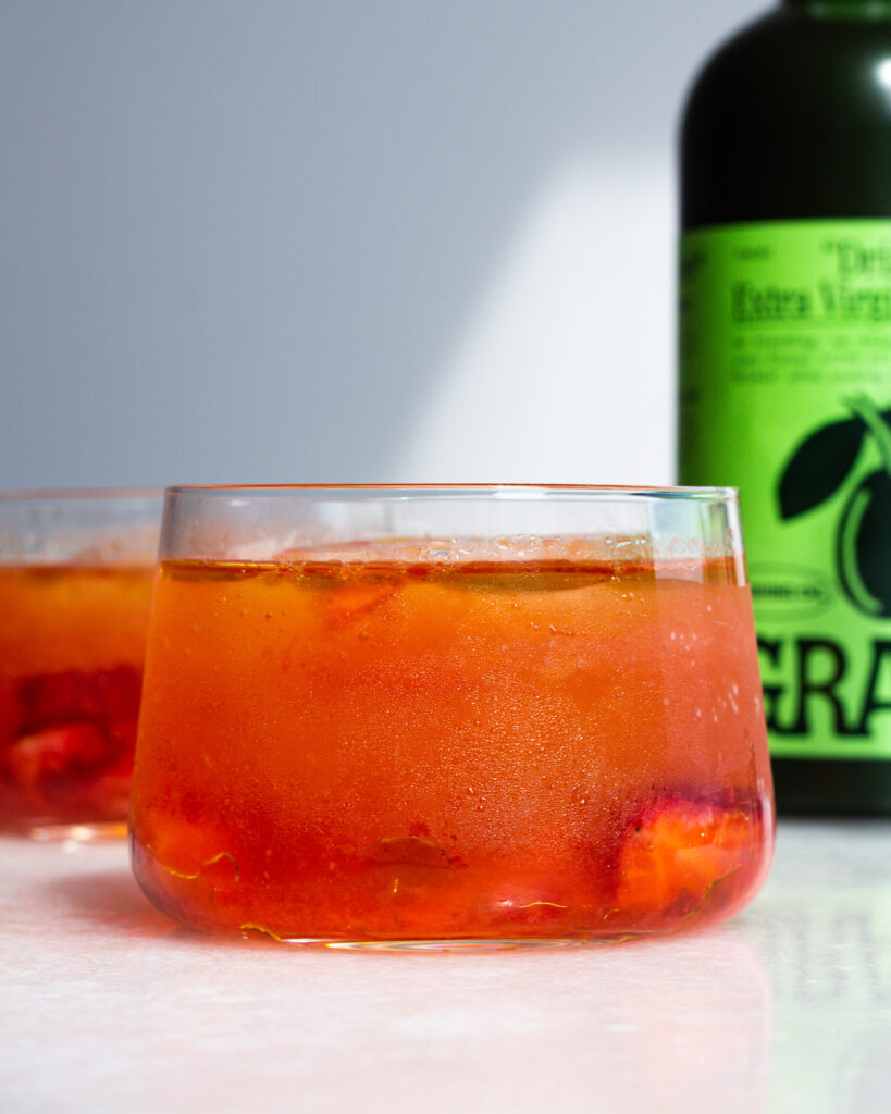 - To a lowball glass, add the strawberries and a large ice cube. Pour the drink over the top and drizzle in any of the remaining strawberry & olive oil left in the bowl.