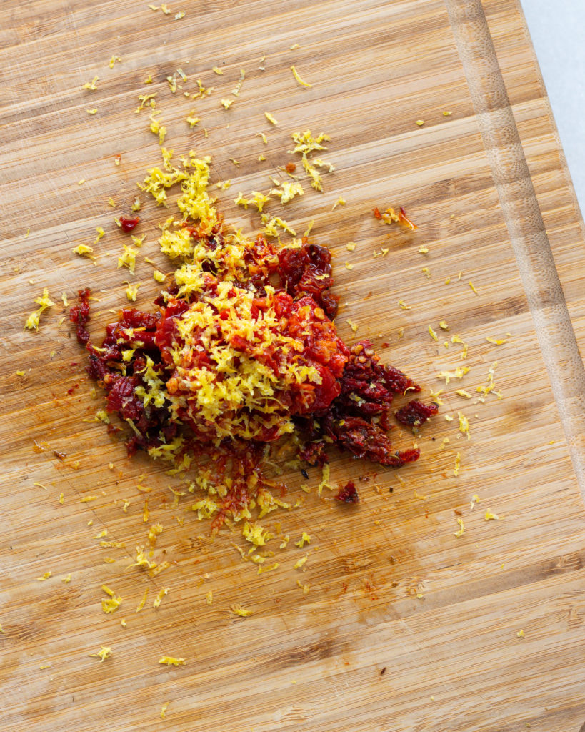- While the chickpeas are roasting, toss together the calabrian chili paste, the sundried tomatoes and the zest from one whole lemon.