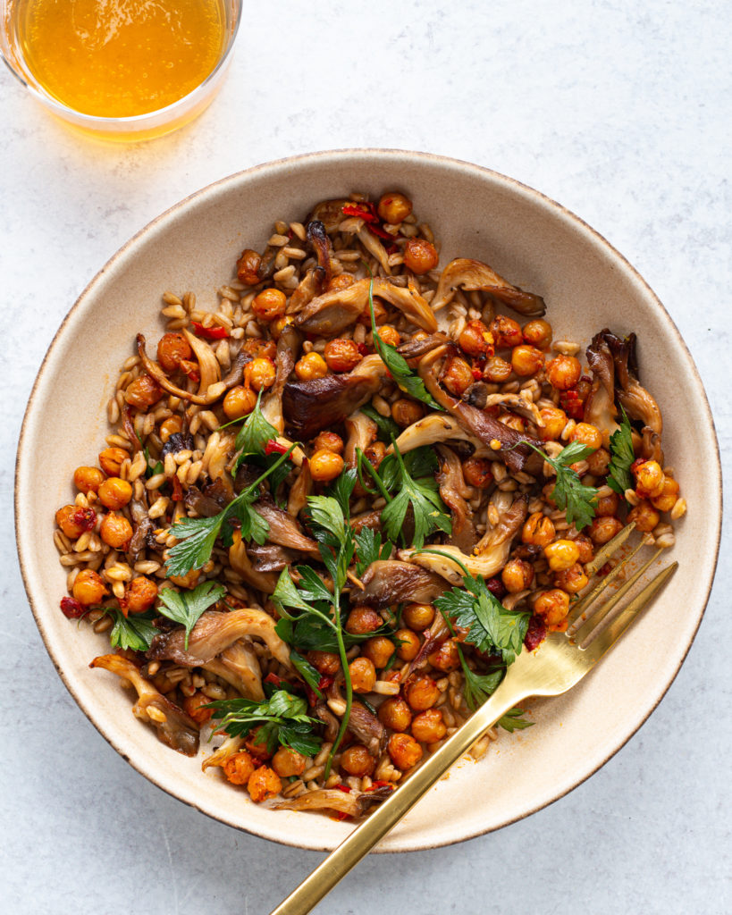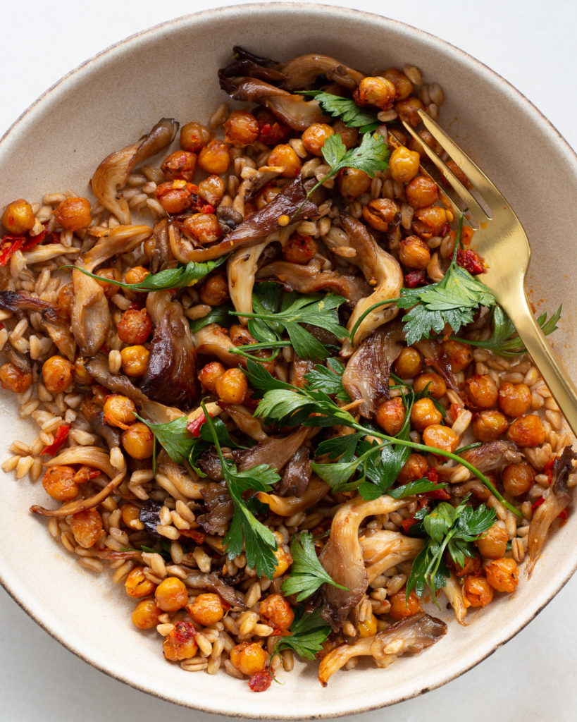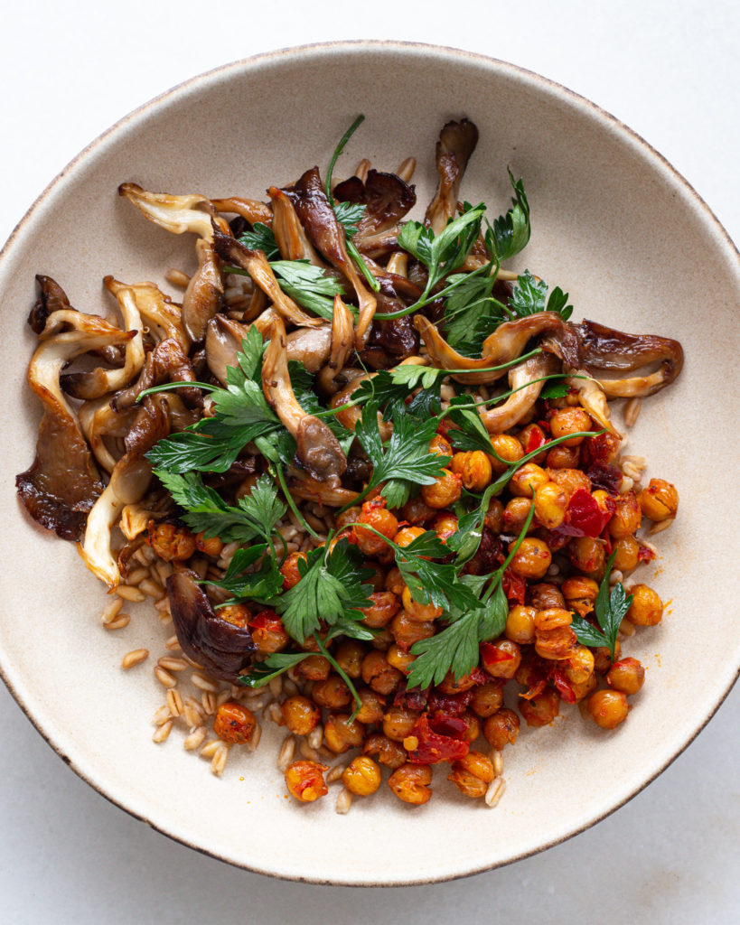 - To assemble the bowl, use the farro as the base, then add the chickpeas, then the oyster mushrooms. Top with the lemony parsley and serve!
