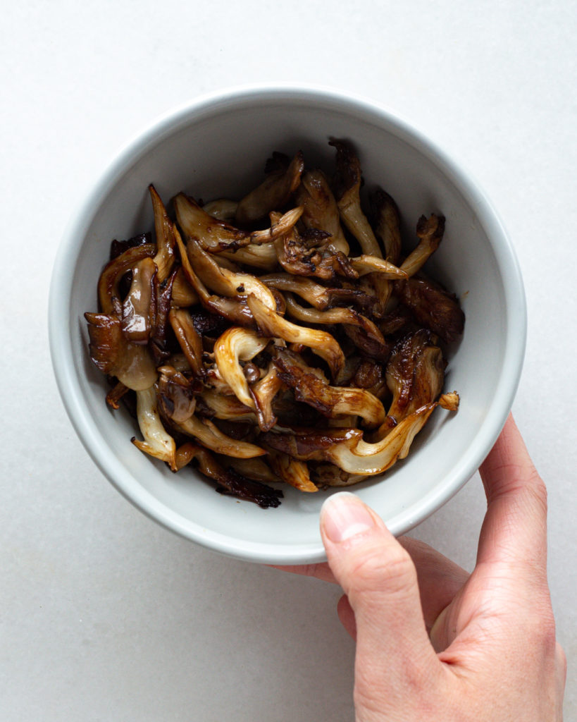- Put a pan on medium heat and add the oil. When the pan is hot, cook the oyster mushrooms in batches. Add them to the pan, drizzle with a touch of date syrup and season with salt. Cook for 2 minutes without touching them, or until they are brown on one side. Then flip and cook another two minutes. Repeat until all the mushrooms are crispy and set aside.