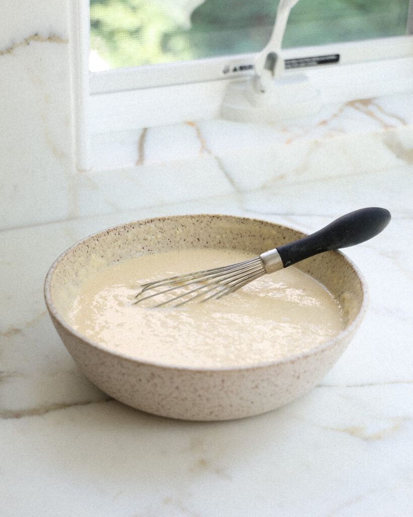 I suggest making this with raw corn when it’s at its peak, but frozen corn would be completely fine, too. We want to have the corn raw, though. It will cook along with the pancakes, which lets their texture and sweetness turn out perfectly.