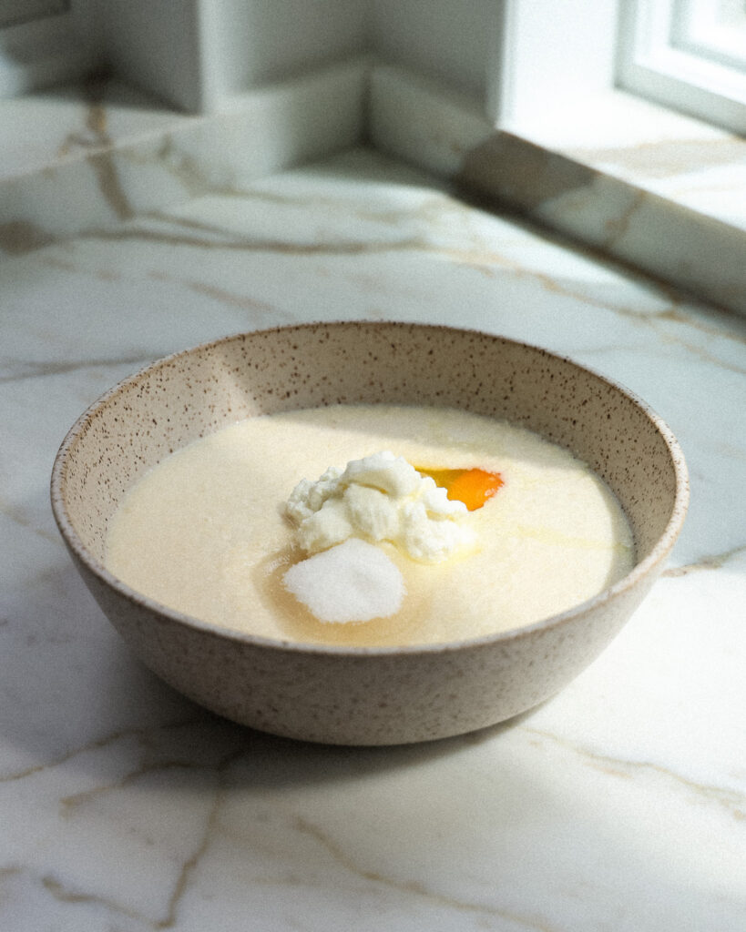 - Whisk in the 115 grams of Greek yogurt, 1 large egg, and 50 grams granulated sugar until smooth. Add 1 teaspoon salt, 1 teaspoon baking powder, 1/2 teaspoon baking soda and 210 grams of all-purpose flour. Mix into a batter.