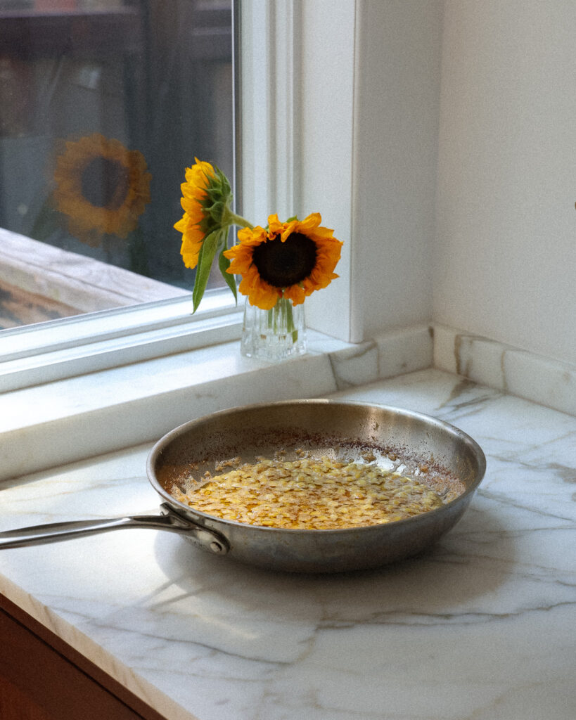- To make the corn brown butter, add 113 grams of butter to a medium sauté pan. Add the 145 grams of corn kernels. Cook over low heat, stirring occasionally for 5-6 minutes or until the butter is golden on the edges and the corn is starting to pop. Remove from the heat and let cool for a few minutes before adding it to a food processor. Pulse until mostly smooth, but leave some corn texture. Either chill in the fridge or let this cool at room temperature until softened. Sprinkle with 1/2 teaspoon of flaky salt.