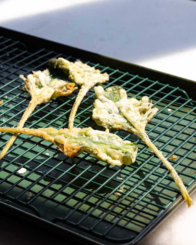 - Transfer the fried greens to either a drying rack over a sheet pan or a layer of paper towels to drain.
