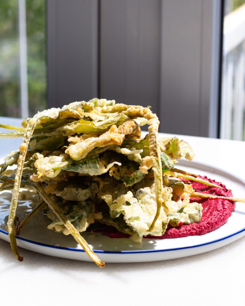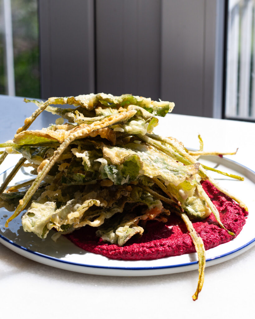 As soon as I finished developing this recipe for Tempura Fried Beet Greens I looked at my plate and said out loud to myself: “Food is SO fun.” And it’s cheesy, but it’s true. Food is SO fun. Especially fun little party recipes like this one. Sure, tempura frying any vegetable is delicious, but I love how making a fun tempura-fried snack also leads to less waste. Beet greens, especially in the spring, are really sturdy and really delicious, and they make a crispy, somewhat sweet tempura. And then, you aren’t throwing any of your beets away! Plus, pair them with a beet purée (also included in this recipe!) and it’s a real show-stopper of a snack.