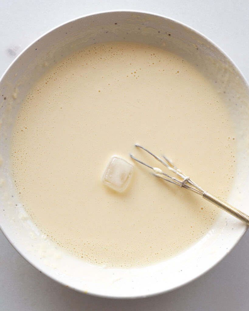 - In a large shallow bowl, whisk together the ice water and the egg. Gradually add in the flour, whisking constantly so that the batter is smooth. Add the salt and mix.