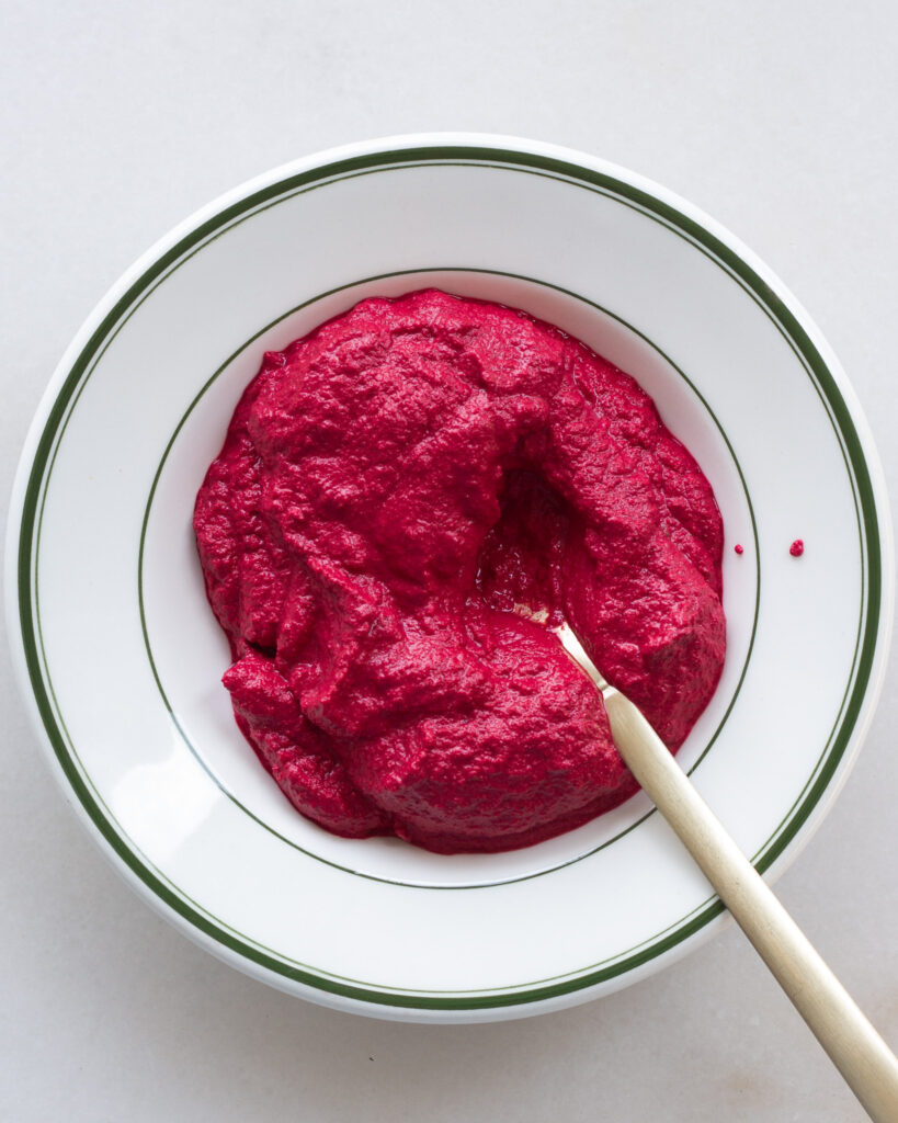 - Add the beets, cashew cream, garlic, lemon zest and lemon juice to a blender. Blend until you get a smooth purée, adding splashes of water if needed. Taste and season with salt to taste.