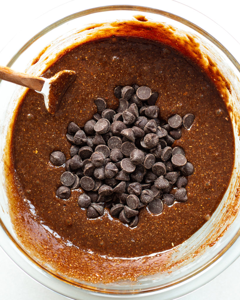 A big tip I have is don’t be afraid of mixing this dough. You can’t build up gluten strands in this, so getting it well combined won’t make it tough, but will make it so your flours are evenly distributed. This will help create an even (and chewy!) texture for these gluten free brownies.