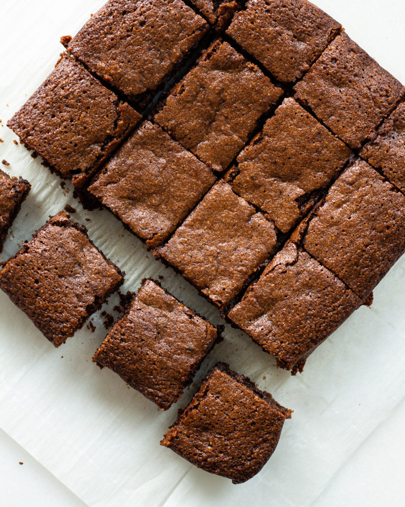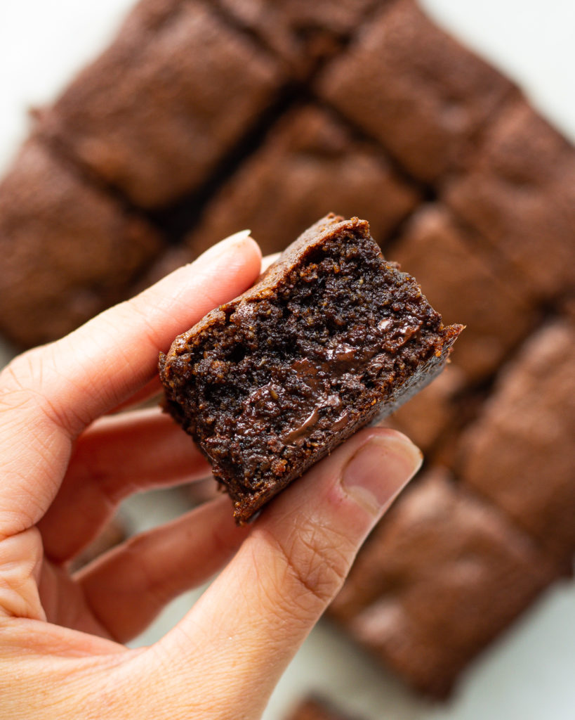 Everybody has their own brownie preference, and this recipe is definitely made for the fudgey brownie lovers. Cakey brownies tend to have a higher ratio of flour to fat, but with this recipe we have a lower flour amount, making chocolate-filled, dense and rich dark chocolate brownies. The olive oil helps make these the best fudgey brownies around, and the fact that they are dairy free is just an added bonus.