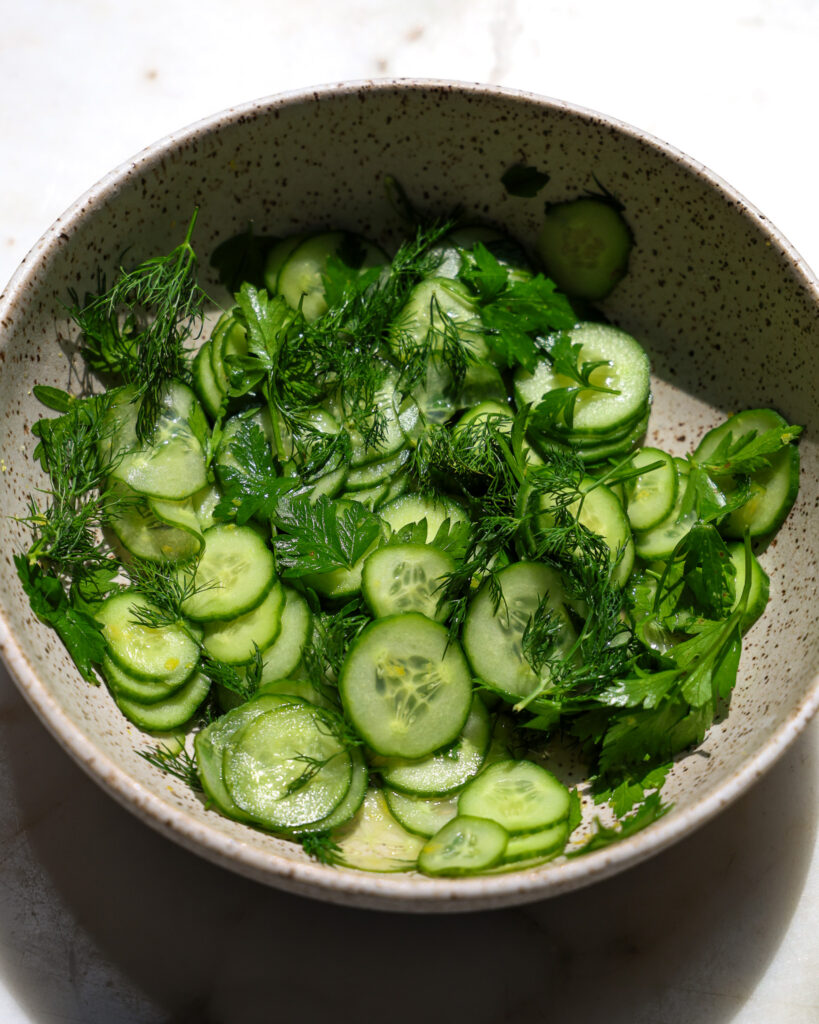 - Thinly slice the 3 cucumbers then add them to a large bowl along with 1/3 cup parsley, 1/3 cup dill, zest from half the lemon, and juice from the whole lemon. Season with 1/2 teaspoon of kosher salt and freshly ground black pepper then toss until combined. Set aside.