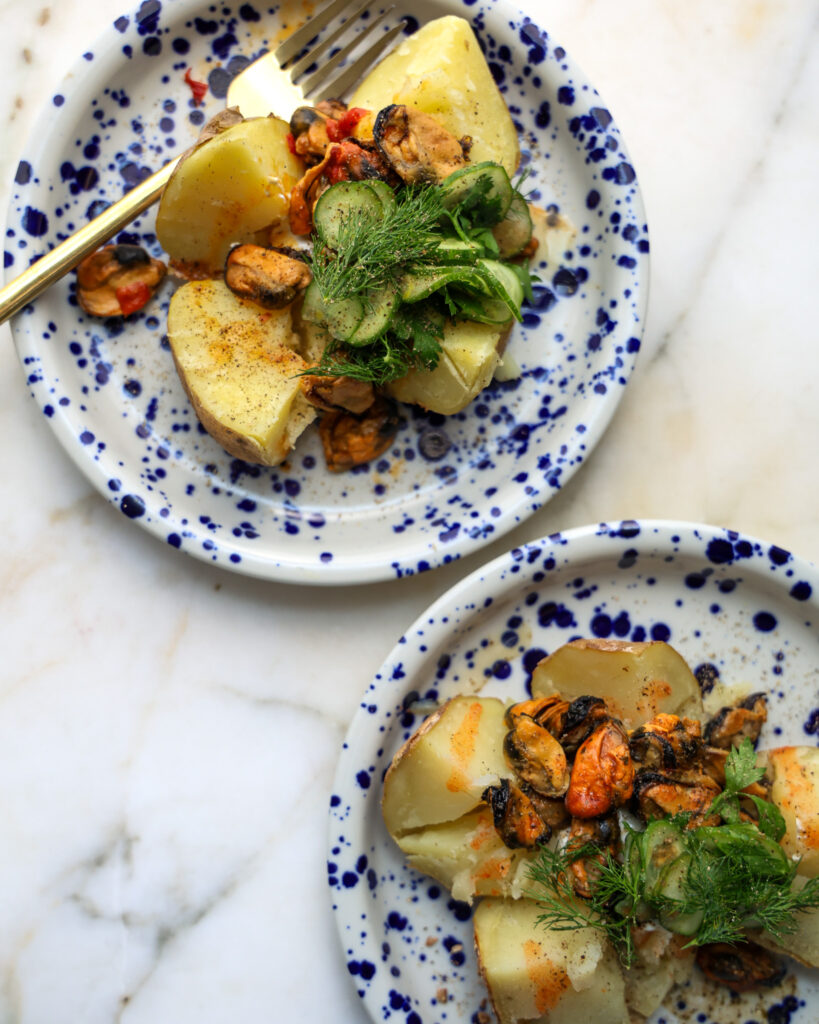 I know, I know, we are all trying to find ways to eat our tinned fish, but sometimes alone on toast with a pickly salad and kewpie mayo is the way! Until you get bored of that, and that is when I would like to introduce you to these Tinned Fish Jacket Potatoes. A salty baked potato that roasts in the oven while the tinned fish warms alongside it, bubbling in its oil. From there, add a bright salad and a bit of Greek yogurt, and lunch is set.