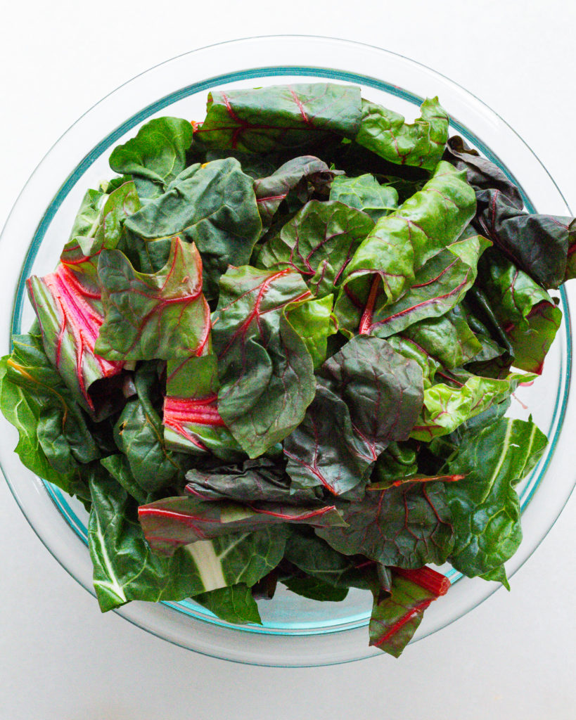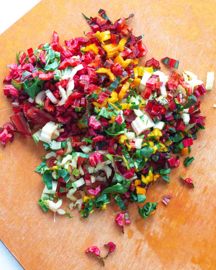 - Chop off the leafy ends of the swiss chard. Roughly chop the leaves into large pieces and set aside. Thinly chop the stems.