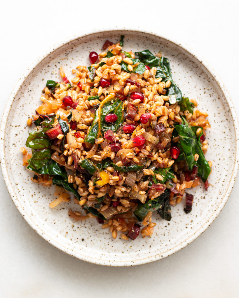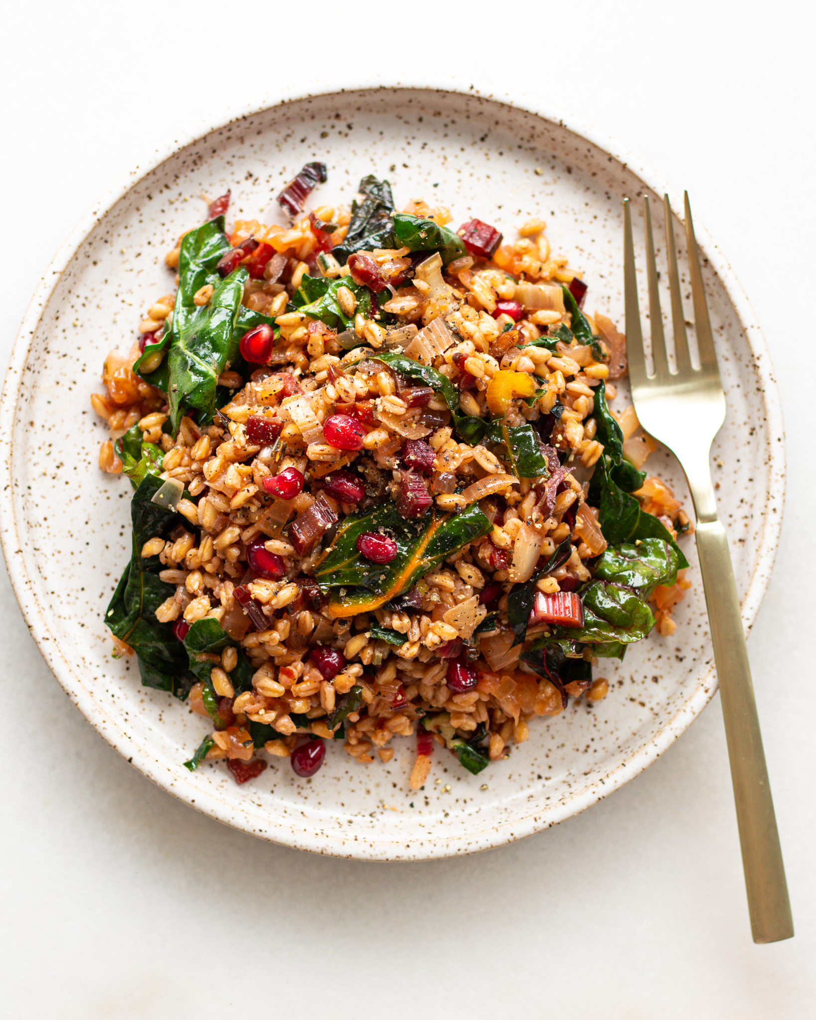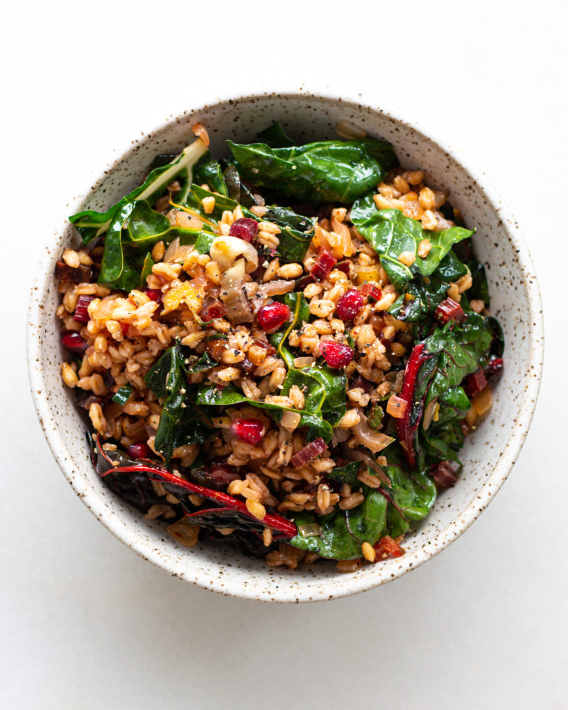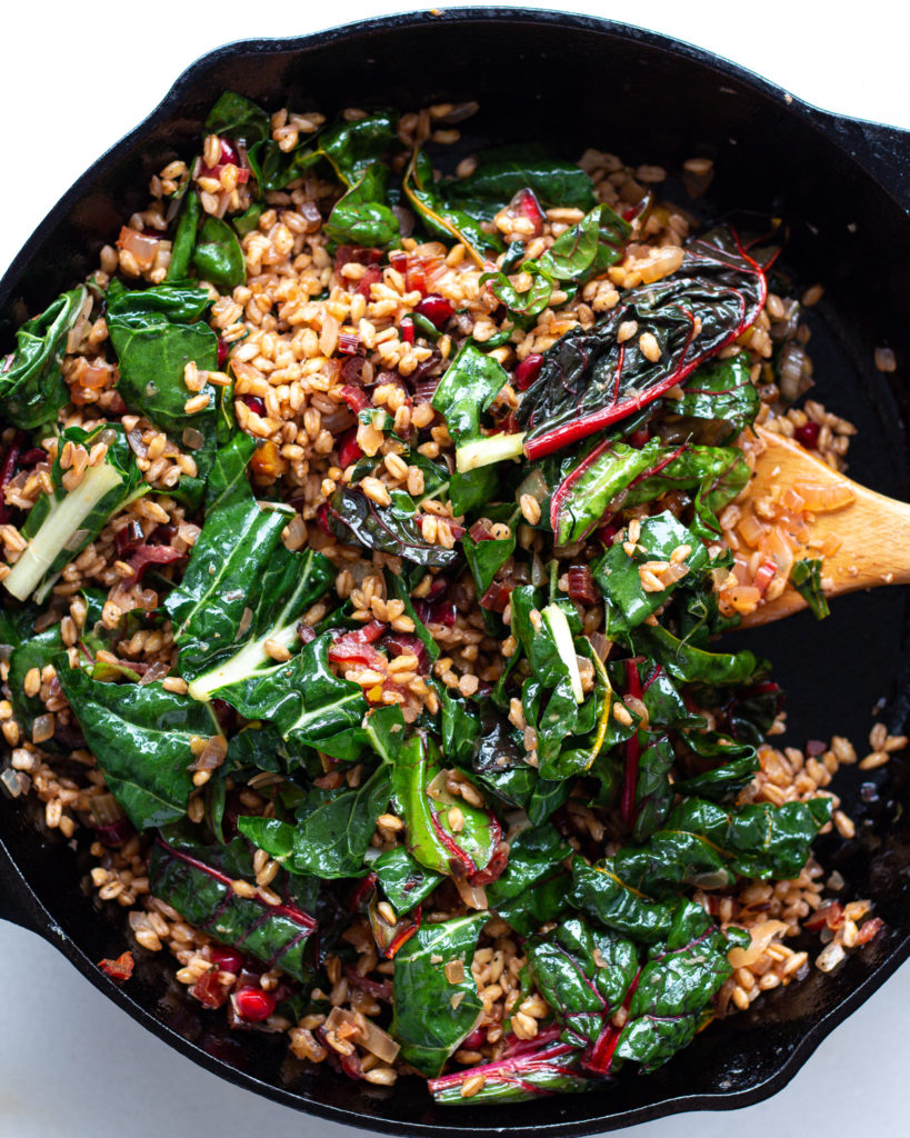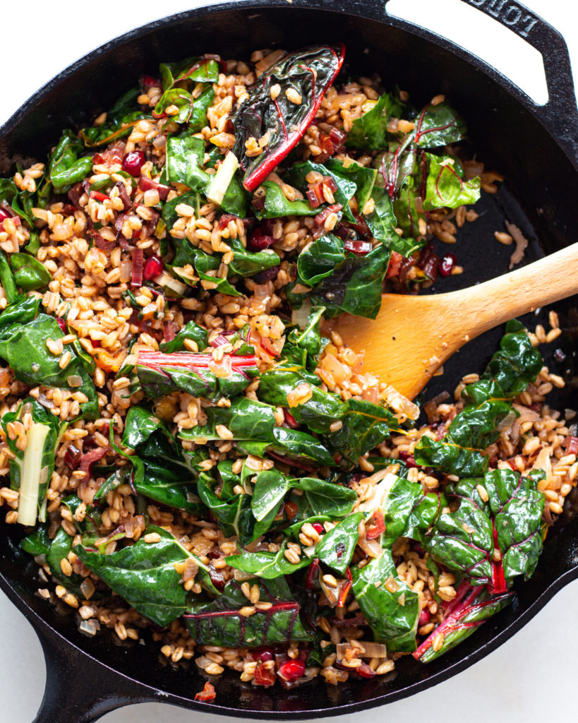 - Toss in the swiss chard leaves and let the heat from the farro mixture naturally wilt them down. Remove the pan from the heat and stir in the pomegranate seeds.