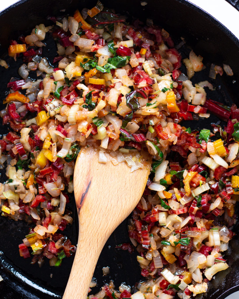 - Add in the chopped swiss chard stems (stems only) and cook down, stirring occasionally) until the stems are softened, about another 4 minutes. Season to taste.