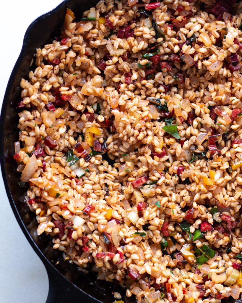 - Add in the farro and stir until the farro and vegetables are well combined. Toast the farro for 2 minutes and them bring the skillet to low heat.