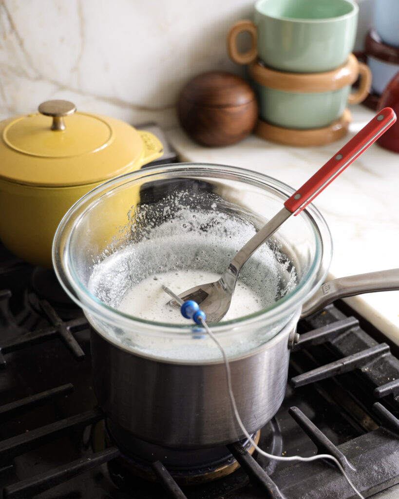 - Add the egg white and 55 grams of granulated sugar to a heat-safe bowl. Using the double-boiler method, put this bowl over a pot that has a few inches of water in it. Bring this pot to a simmer and whisk the egg white constantly, until it reaches 115°F.