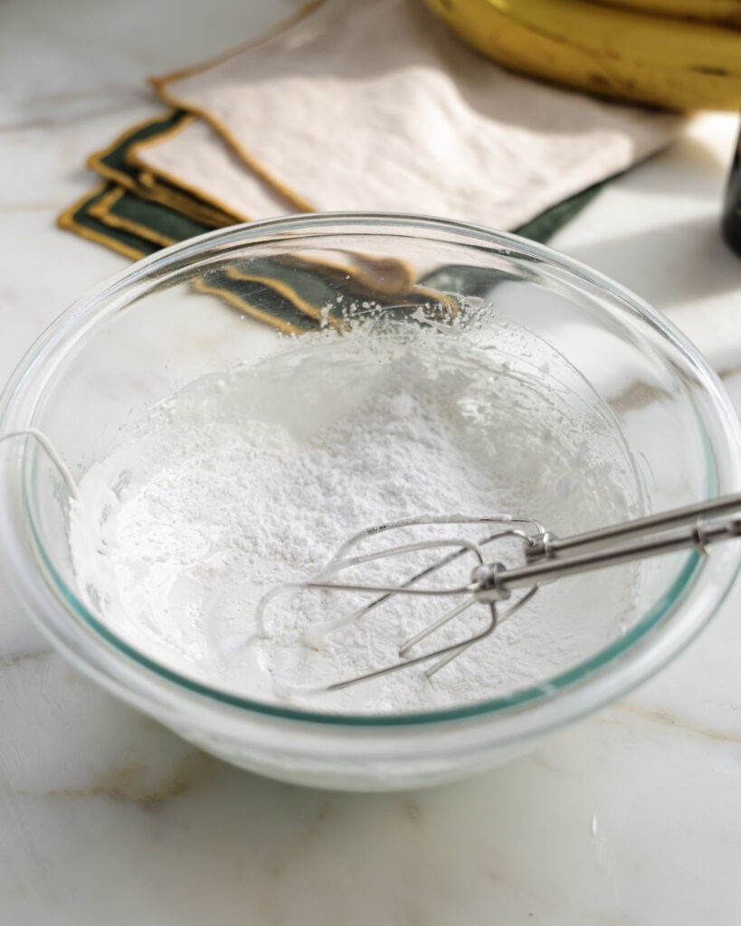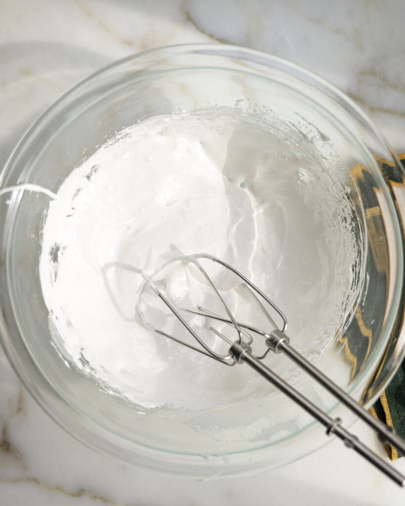 - Remove the egg white from the heat and use an electric hand mixer to whip it until you have soft peaks. Add 20 grams of powdered sugar and whip again.