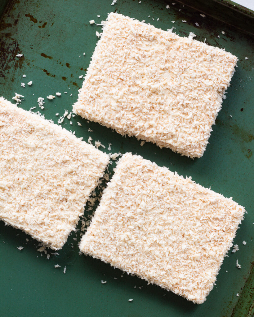 5. Carefully dip each piece of tofu in the whole wheat flour first, fully coating the surface area. Transfer to the plant based milk for a quick dunk, allowing any excess to drip off before then carefully transfering to the panko breadcrumbs, flipping the tofu to fully coat it. Set these cutlets aside.