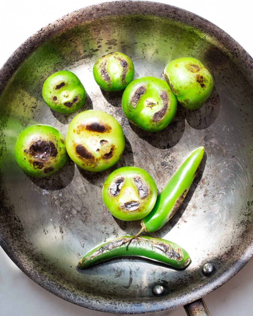 - Set a small sauté pan over medium-high heat. Add the tomatillos and Serrano pepper and let cook, shaking every now and then, for 4-6 minutes or until the tomatillos and pepper are blackened on all sides.