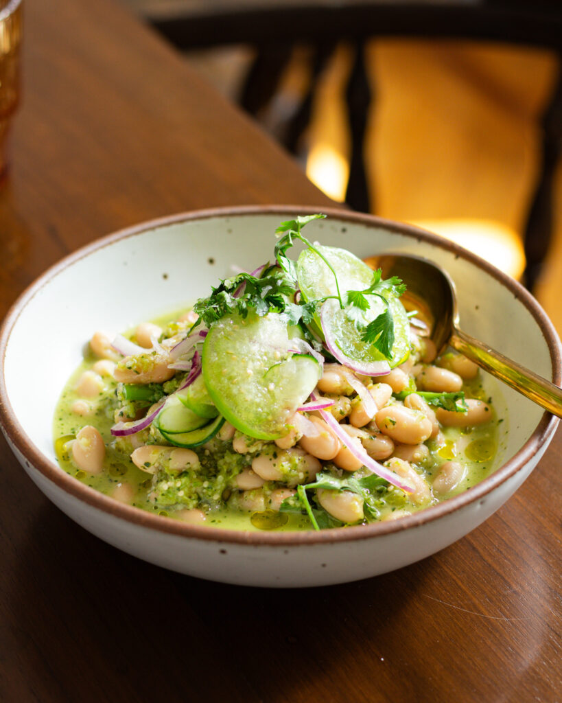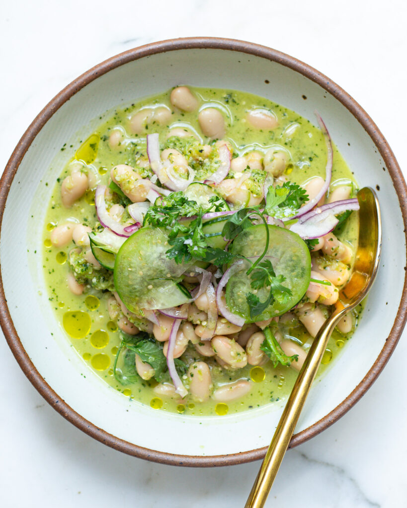 This recipe takes a charred tomatillo sauce and combines it with beans and a simple cilantro salad to make a meal-prep worthy meal that I like to prep at the beginning of the week and then take with me for lunches or sides as I need it. It’s also a wonderful weeknight meal for the final days of summer’s heat.