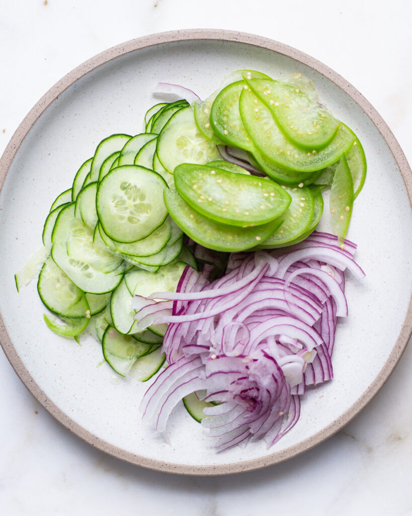 - Make the simple cilantro salad by thinly slicing the red onion, cucumber and tomatillo and adding it all to a small bowl. Roughly chop the cilantro and add it in. Give a few tosses and season with the lime zest, lime juice, and salt. Set aside.