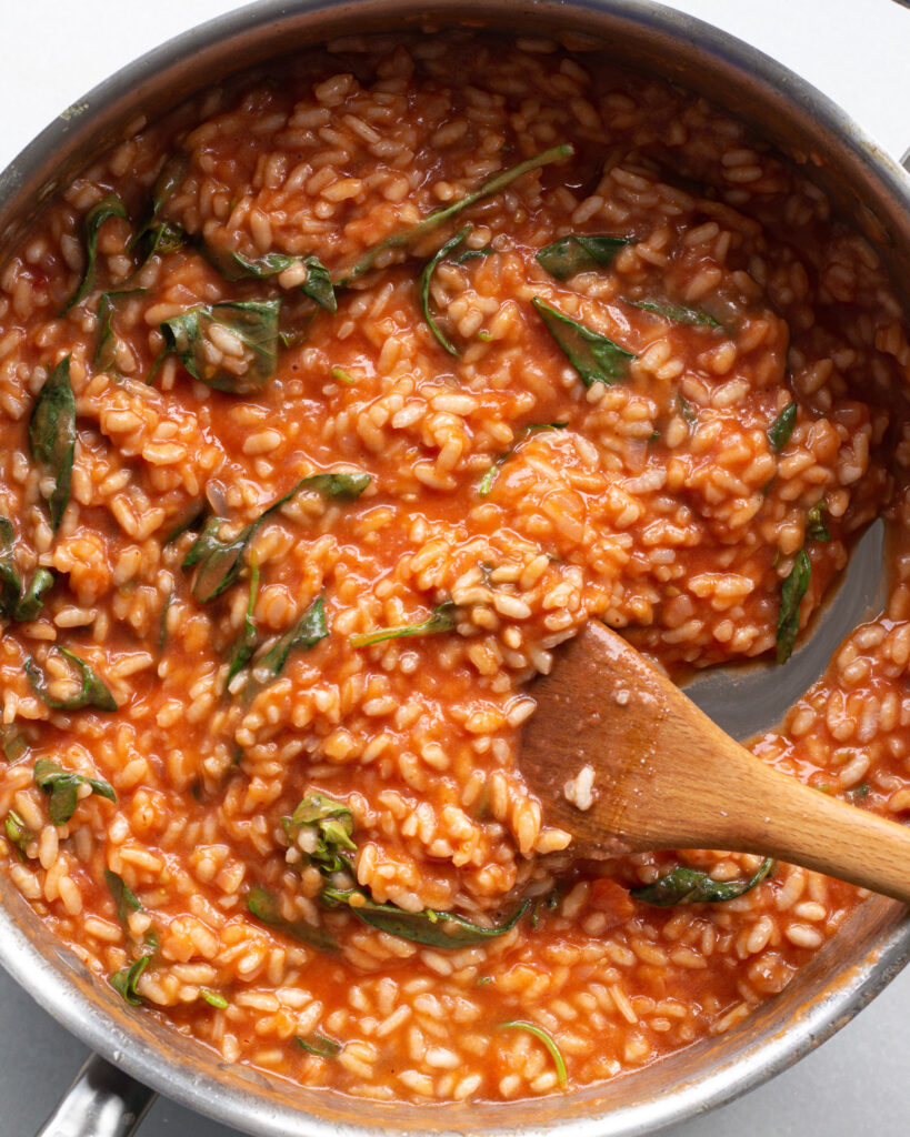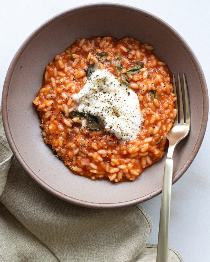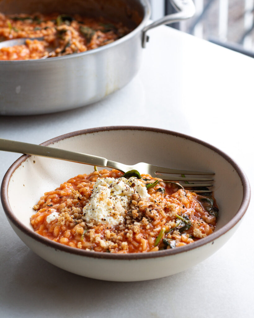 This simple and summery Tomato Basil Risotto is everything I want in a one-pan meal. It is loosely inspired by Pan Con Tomate, or Spanish Tomato Bread, because it grates the tomatoes into a purée before adding them into the risotto. This gives it a light tomato flavor, but still all the richness from classic risotto that we know and love. The recipe uses a classic risotto method, meaning that this creamy, dreamy dish is gluten free and can be easily adapted to be made vegan. Of course, if you aren’t plant-based, you are more than welcome to add a huge dollop of ricotta to every bowl, it’s one of my absolute favorite toppings, and killer in this bowl.