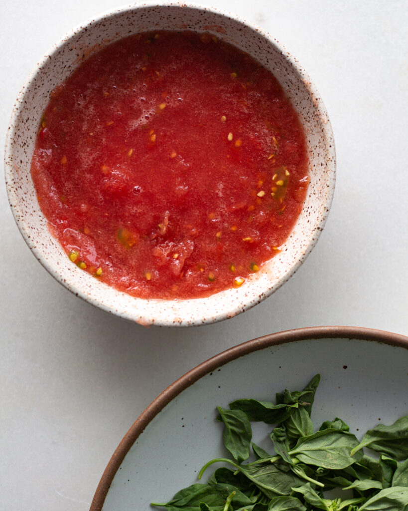 - Quarter the tomatoes using a microplane, then grate the insides of the tomatoes into a small bowl, making almost a gazpacho. Discard the skins and set aside.