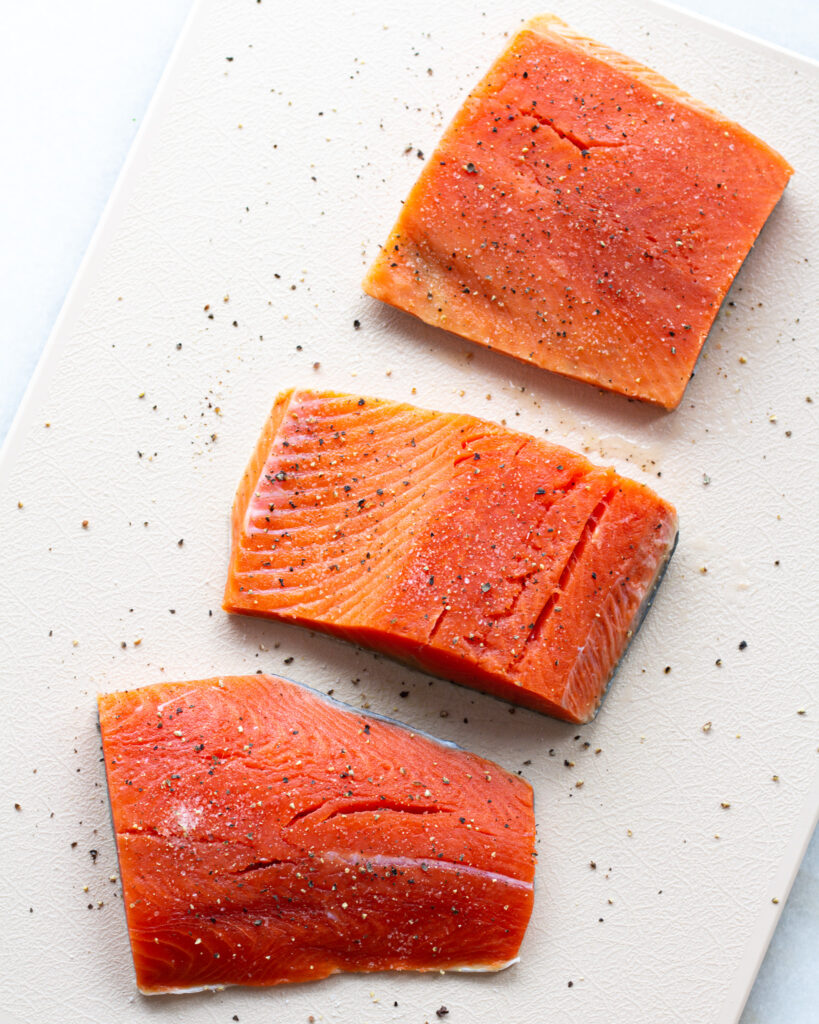 - Season each salmon fillet with a pinch of salt and a few cracks of black pepper on either side.