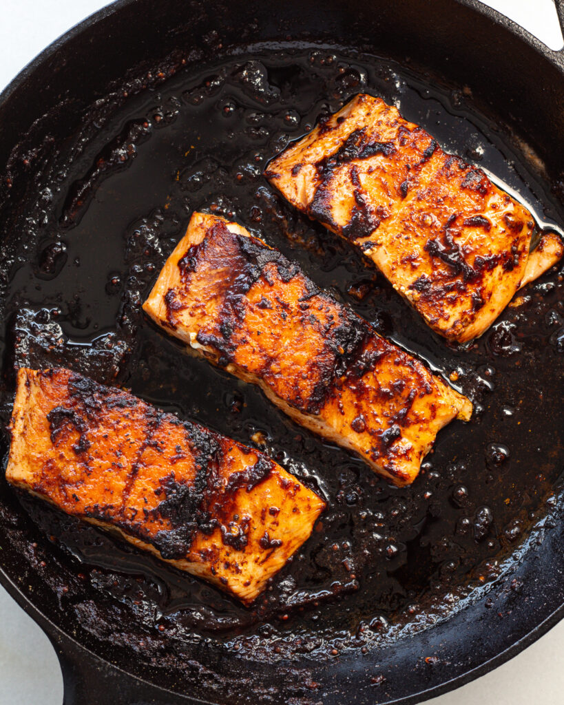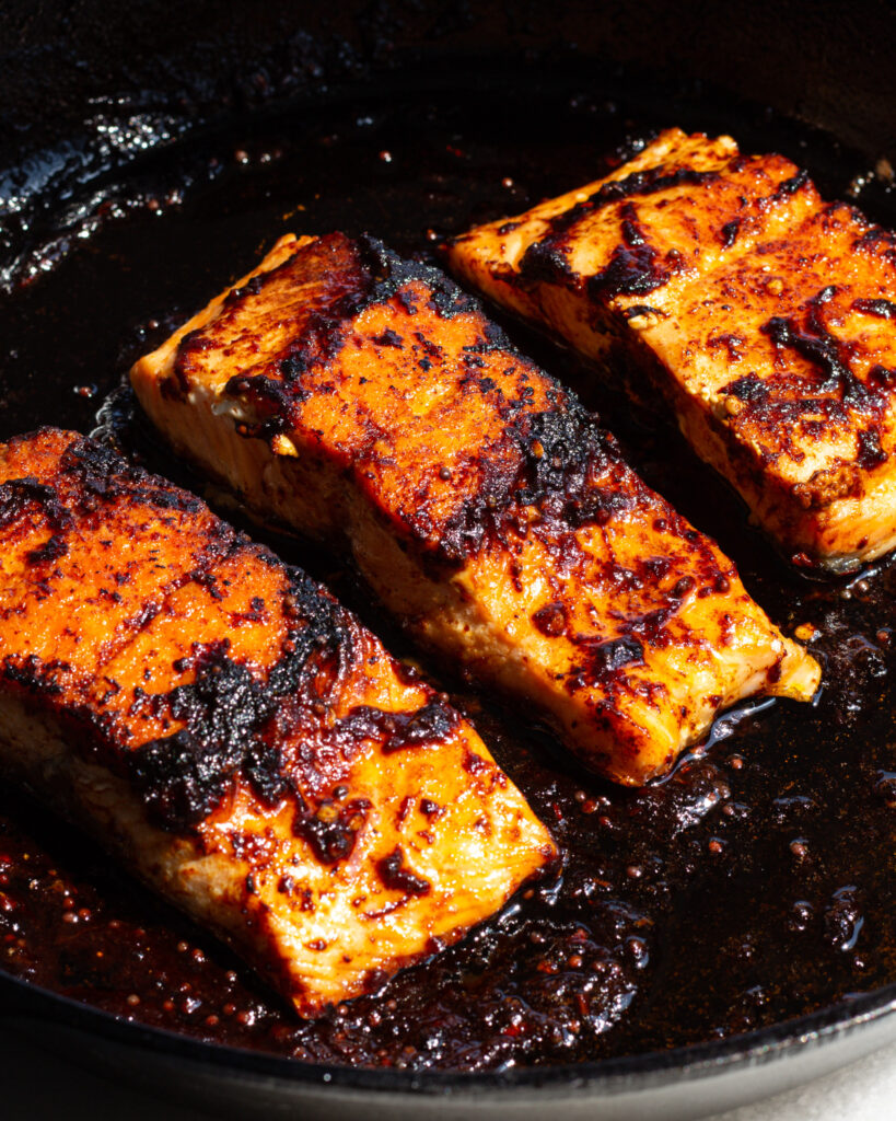 I like to use cast iron because it retains a high and even level of heat across its surface. However, it’s only best to use if it is very well seasoned and has been in use for some time. If you do use a cast iron, the pros are that you will get a darker crust on your salmon, with a slightly crispier skin.