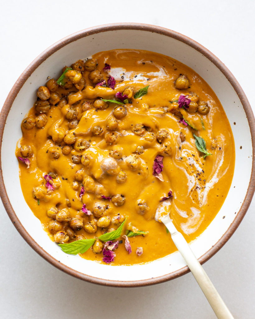 To serve, add the soup first, a generous scoop of chickpeas, and garnish with any herbs or heavy cream. Add some cracks of black pepper and enjoy!