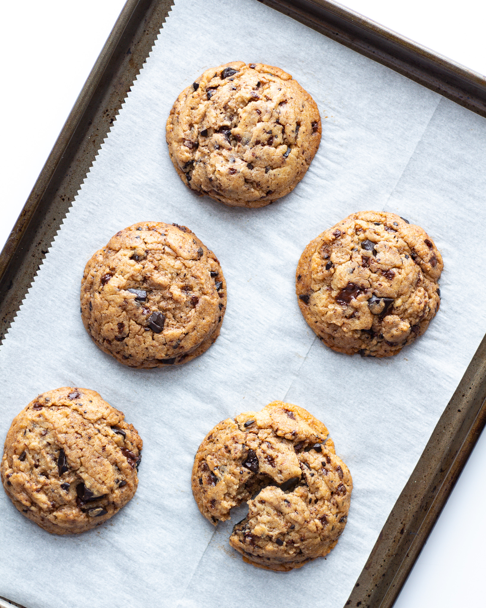 And I promise, this recipe is worth the wait. It uses three types of sugar (one of them being date paste, which is insane), vegan brown butter and tons of dark chocolate. It’s moist but not greasy. Fluffy but still chewy. And it spreads just enough to still give that crinkly edge. It’s definitely a bit of work, but this cookie is SO worth it.