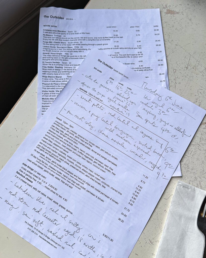 The Outsider – you know how much I love a handwritten menu and a cheeky wine list. This place has stunner views of the Edinburgh Castle, so it fills up with tourists and locals alike. They only take bookings by phone, but I highly, highly recommend a reservation.