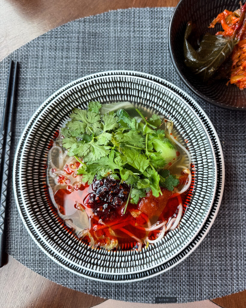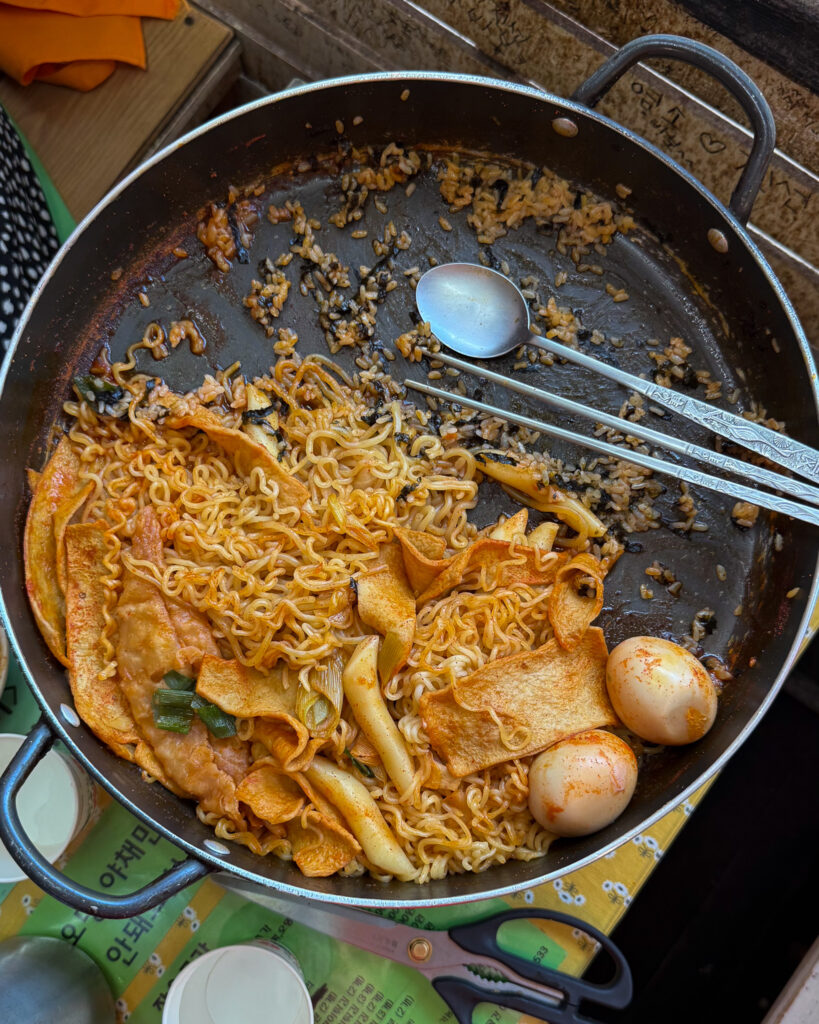 I asked a local friend where was the best place to get tteokbokki. He mentioned this place and then WhatsApp-ed me exactly what to order. Out came a bubbling tray of tteokbokki, instant ramen, eggs, and dumplings with glass noodles.