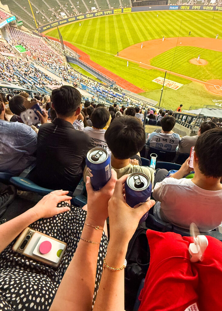 I really believed “we have baseball at home” until I saw how different Korean baseball culture is to ours. When the home team is playing, every time a player comes up to bat the crowd knows their two coordinated songs and dances to cheer them on. The cheering is nonstop. There is a “mandatory dancing” seating section. It’s so fun and you definitely will want to learn the dances by the end of it.