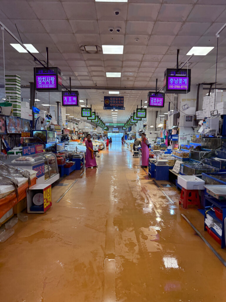 This was one of our more fun and interactive food stops in Seoul. This is a working fish market and the largest fish market in Seoul. You can buy fish or sashimi in the downstairs area, and then take the escalators upstairs and have whatever you ordered prepared for you.