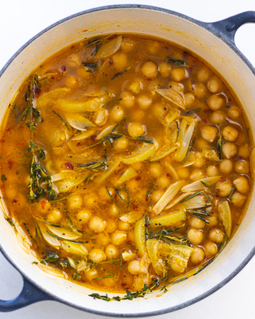 - In a large dutch oven on medium heat, add the olive oil. Toss in the garlic and cook for 1-2 minutes, or until the garlic is lightly golden. Add in the rosemary, thyme, preserved lemon, red pepper flakes, and just a bit of salt and pepper. Add in the chickpeas. Cook for another 2-3 minutes to let the flavors come together and to remove any “canned bean” taste.