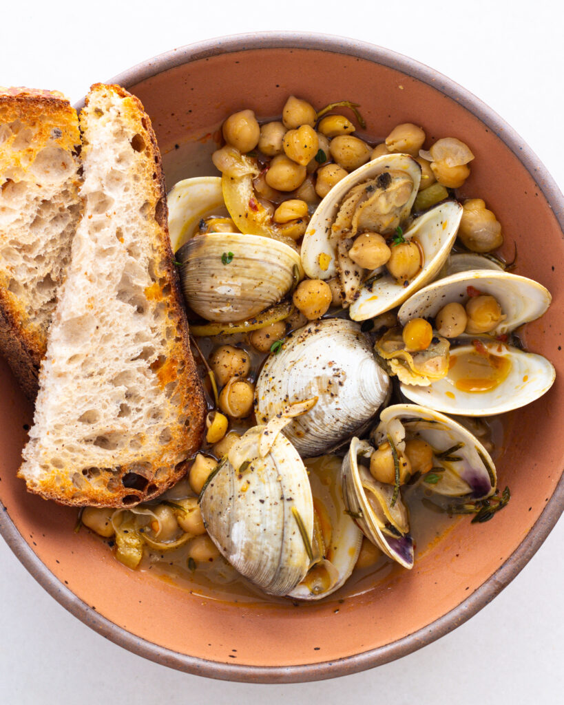 - Immediately pour the clams into two separate bowls, spooning over the broth and the chickpeas into each bowl. Add a slice of crusty bread, garnish with thyme and serve with Italian chili oil for drizzling. Dip, eat and enjoy!