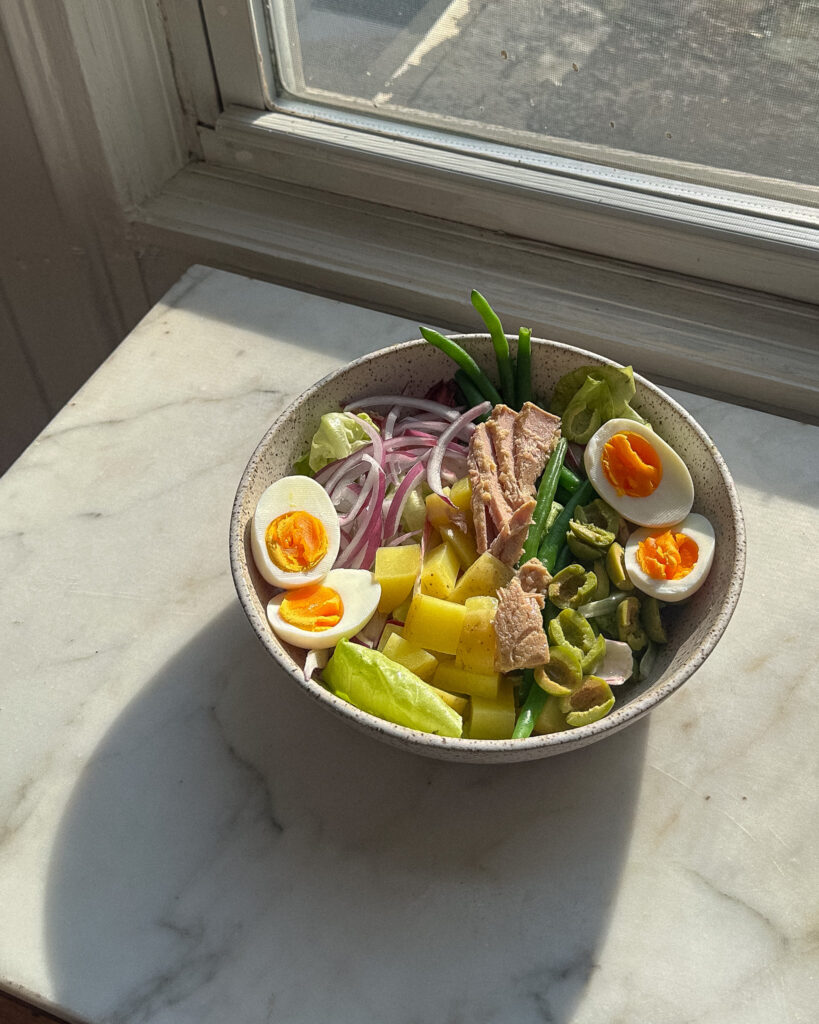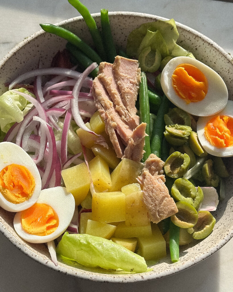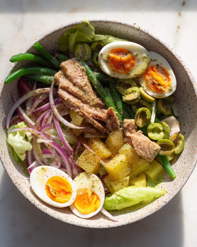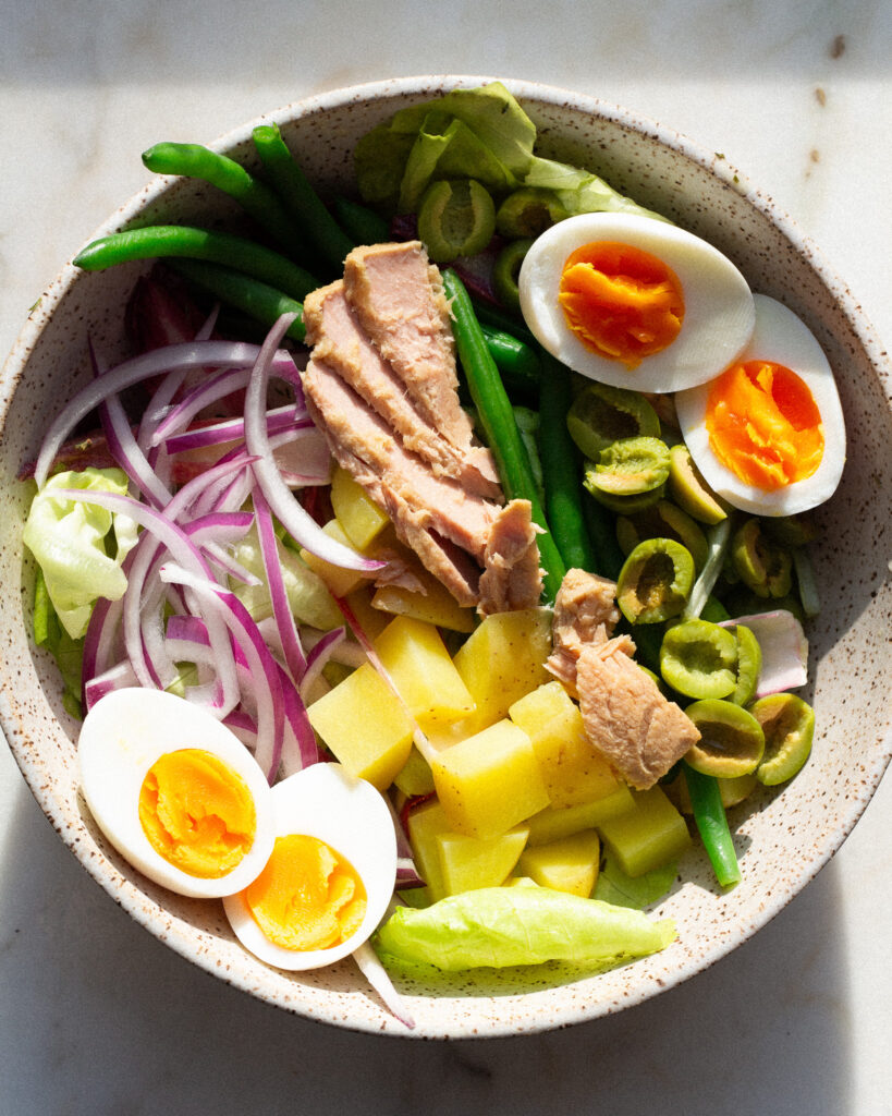 - To plate, top the bowls with equal servings of the red onion, chopped potatoes, blanched green beans, castelvetrano olives, and jarred tuna. Peel and halve the eggs and add two to each bowl.