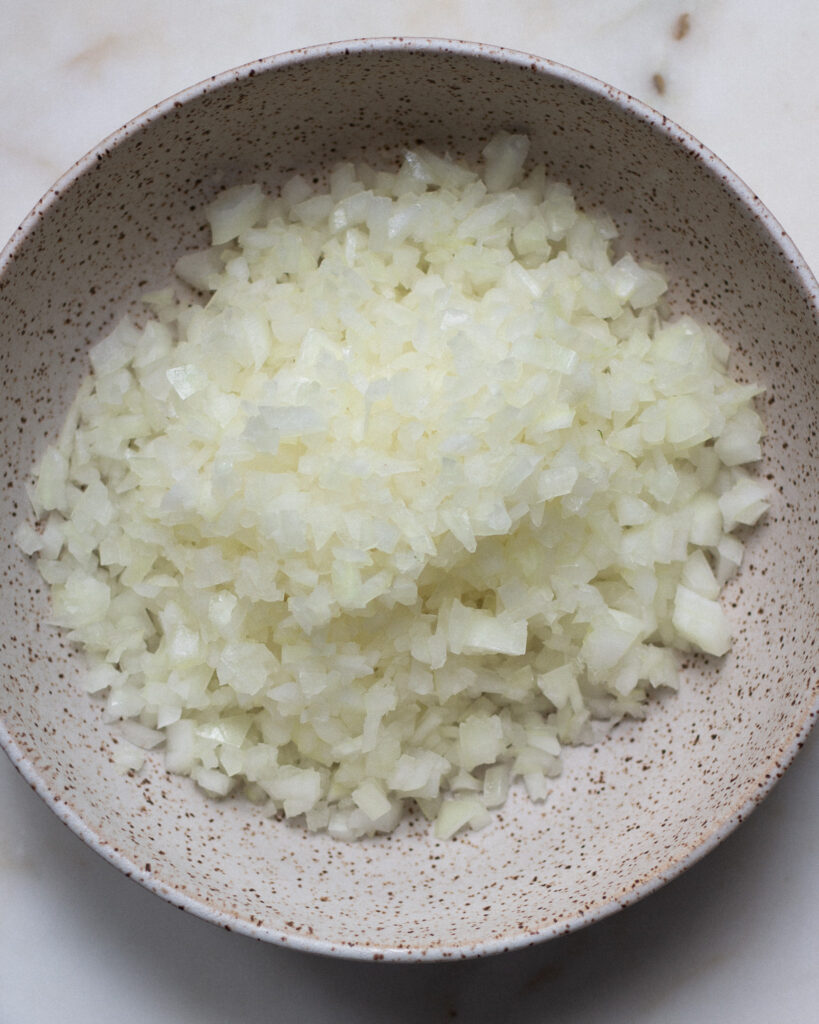 Along with the zucchini, you will want to finely dice one yellow onion. The finer the dice, the better, since we want the onion to cook down to where it is nearly transluescent.