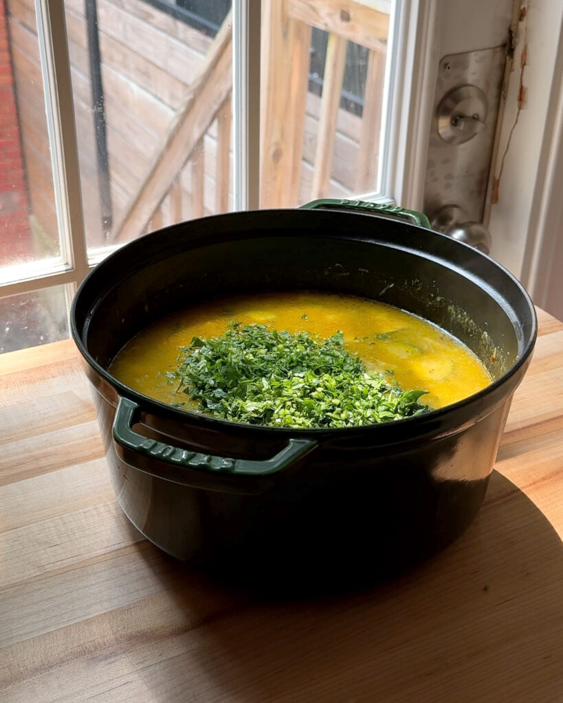- When the soup is done simmering, stir in the chopped parsley and squeeze in the juice from the remaining lemon half. Taste and season with salt as preferred.