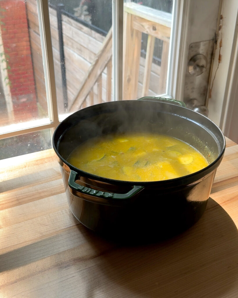- When all of the broth has been added, add the zucchini and potatoes to the pot. Stir and add 2 cups of water. Bring this to a simmer, cover and let simmer for 45 minutes. This will build flavor and get both the zucchini and potatoes to an amazing texture.