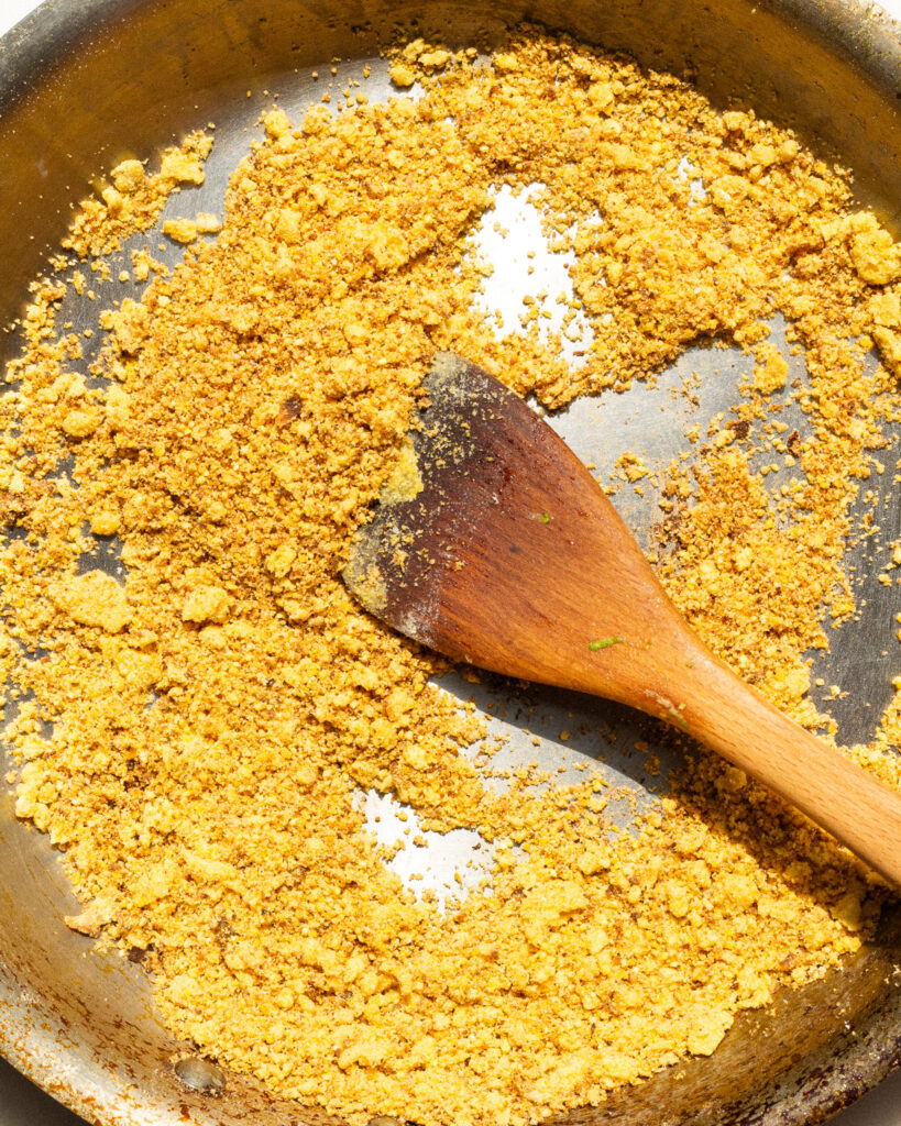 Toasted lemon pepper polenta is a mad-science creation of my own invention (I think? I’m sure it’s been done before). But with my soups I always need a little *something* crispy on top, whether that’s croutons, crispy rice nuggets, or just toasty bread on the side. With this soup, I wanted something a little lemony, but also rich with corn-fried flavor. Enter scene: polenta. My perfect answer.